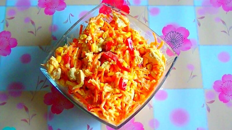 ► Салаты ИНГРЕДИЕНТЫ: ПРИГОТОВЛЕНИЕ: Приготовьте удобную емкость для салата, в ней мы будем все только смешивать. Мясо порежьте кубиками и положите в миску. Кукурузу откройте и добавьте к мясу. Морковку добавьте к остальным ингредиентам. Помидоры промойте и нарежьте средними кубиками. Высыпьте их в миску. Добавьте майонез, и отставьте салат. Перед подачей добавьте в салат сухарики и еще раз все смешайте. Приготовьте красивую тарелку и переложите в нее салат, но не забудьте придать ему интересную форму.