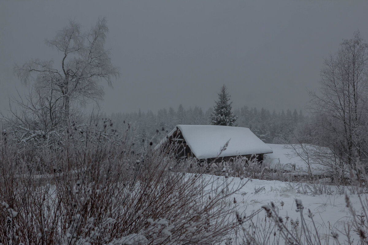 Зимний вечер в Карельской деревеньке. В зимнем монохроме, в поисках текстуры, цвета и фактуры, занесло мой взгляд на хутор Хухтерву. Ровно год эти фотографии ждали своей очереди, и вот я с вами делюсь этой душевной финской деревней. Карелия. Декабрь 2018.