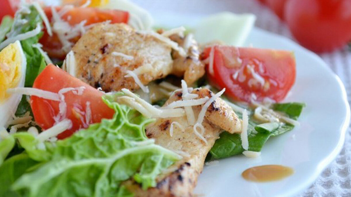 ► Салаты ИНГРЕДИЕНТЫ: ПРИГОТОВЛЕНИЕ: Куриную грудку приготовить на пару (так она будет сочнее) или отварить, порезать средними кусочками. Огурец, листья салата и помидор помыть, обсушить. Салат порвать или крупно порезать, положить к курице. Огурец разрезать вдоль и нарезать кусочками. Положить все это к куриной грудке и хорошо перемешать . Помидор нарезать крупными кусочками и добавить к салату. Аккуратно перемешать, чтобы не повредить помидор. Куриные яйца заранее отварить, очистить, и также крупно нарезать. Аккуратно добавить в салат. Заправить оливковым маслом/йогуртом натуральный, сверху посыпать натертым на мелкой терке сыром — по вкусу.