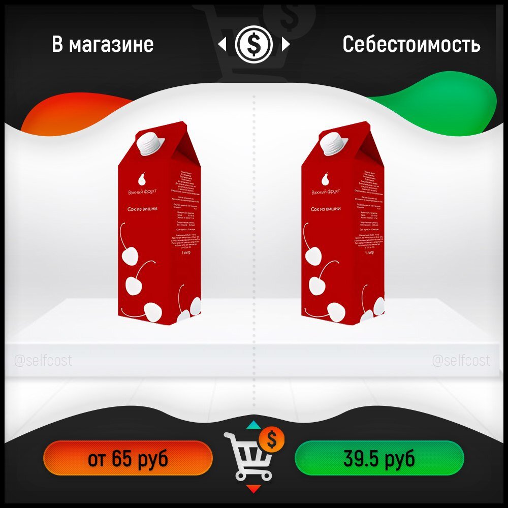 Себестоимость 1 литра сока составляла 37₽ на 2018 год. Да-да, сок, который стоит от 65₽ за литр имеет такую себестоимость из-за: • Состава • Упаковки • Затрат энергии • Труда рабочих • Доставки заказчику Так как сейчас не 2018 год, а 2019, сама себестоимость сока чучуть выросла и составляет приблизительно 39.5₽ за литр.