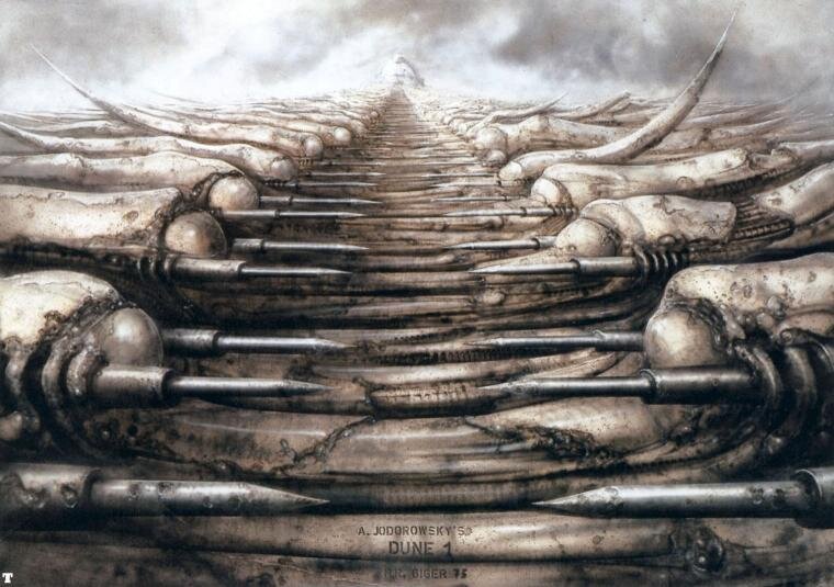 Сегодня можно только сожалеть о том, что не был снят фильм Алехандро Ходоровски " Дюна" в 1975 году. На главную роль Императора планеты Харконненов дал согласие художник - сюрреалист Сальвадор Дали. Вместе с ним планировался дуэт: французский актёр тетра и кино Ален Делон и лидер группы The Rolling Stones Мик Джаггер. Главный художник - Ханс Гигер. Именно он являлся создателем визуальной идеи. Музыку к фильму готовила британская рок - группа Pink Floyd. Дорога на третьей планете системы звезды Канопус была изображена Хансом Гигером как ряды подобных саранче биомеханических солдат. Закрытый тоннель на планете Арракис, как биомеханическая гусеница с человекоподобным лицом в состоянии медитации, создаёт атмосферу ожидания прибытия ценного груза. Ханс Гигер даёт волю своему воображению. Биомеханика в каждом объекте. Цитата : "Люди считают, что в моих картинах изображён мир будущего, но я рисую реальность. Соединяю несколько идей и вещей, а они могут казаться будущим." Образ древнеегип