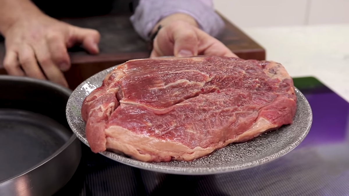 Говядина Лук репчатый Морковь Корень сельдерея Томатная паста (можно заменить перетертыми томатами) Чеснок Красное вино Соль Перец горошком Гвоздика Итак, поехали! Для начала, говядина. Нам подойдет абсолютно любой кусок для тушения. Не стоит покупать дорогую вырезку или то-то еще. В этом просто нет никакого смысла. Нам подойдет любой недорогой кусок говядины, можно даже с косточкой. Мы будем использовать лопатку. Берем толстостенную сковородку, добавляем немного подсолнечного масла и разогреваем ее до максимальной температуры. Для начала, нам нужно "запечатать" наш кусок мяса, задав ему небольшую корочку по всей его поверхности. Для этого мы обжариваем наш кусок по 1-2 минуте с каждой стороны. Корочка, которая сформируется на этом этапе даст невероя