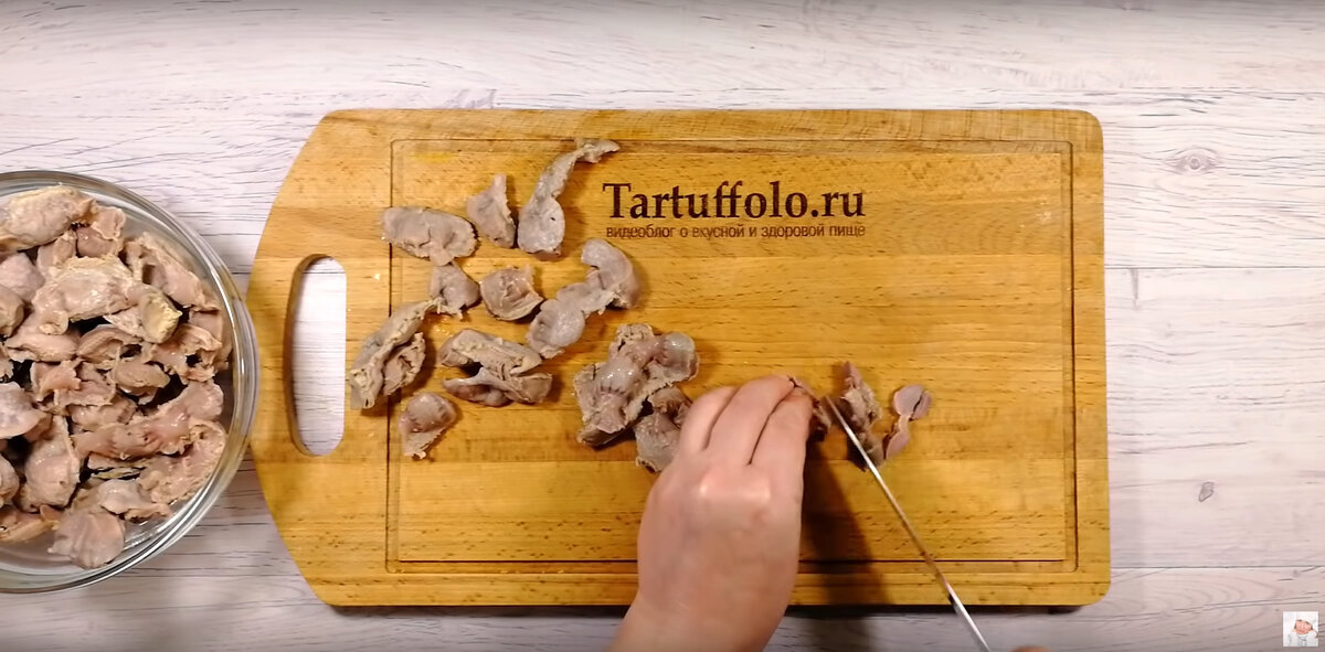 Я подготовила для вас подборку вкусных, экономичных, горячих и холодных закусок к праздничному столу. Что-то вы уже видели, а что-то будет новинкой. Начну с приготовления закуски. В кастрюлю кладу промытые куриные желудочки, заливаю холодной водой. Отправляю вариться на 2 часа, через один час варки я их посолю. Не забываю периодически снимать пену. Готовые желудочки нарезаю соломкой. Сковородку хорошо разогреваю, наливаю совсем немного растительного масла. Отправляю куриные желудки на сковородку и обжариваю несколько минут. В 2 столовые ложки сметаны добавляю 1 чайную ложку с верхом горчицы и немного черного молотого перца. Перемешиваю. Отправляю сметану к желудочкам. В самом конце добавляю 1 столовую ложку лимонного сока. Выкладываю по 2 столовых ложки на поджаренный хлеб. Посыпаю специями и украшаю долькой лимона. Нам такая закуска очень напоминает язык в сметанно-горчичном соусе. Приготовлю салат. Салат будет просто удивительный, никто не верит что он состоит всего их двух главных и