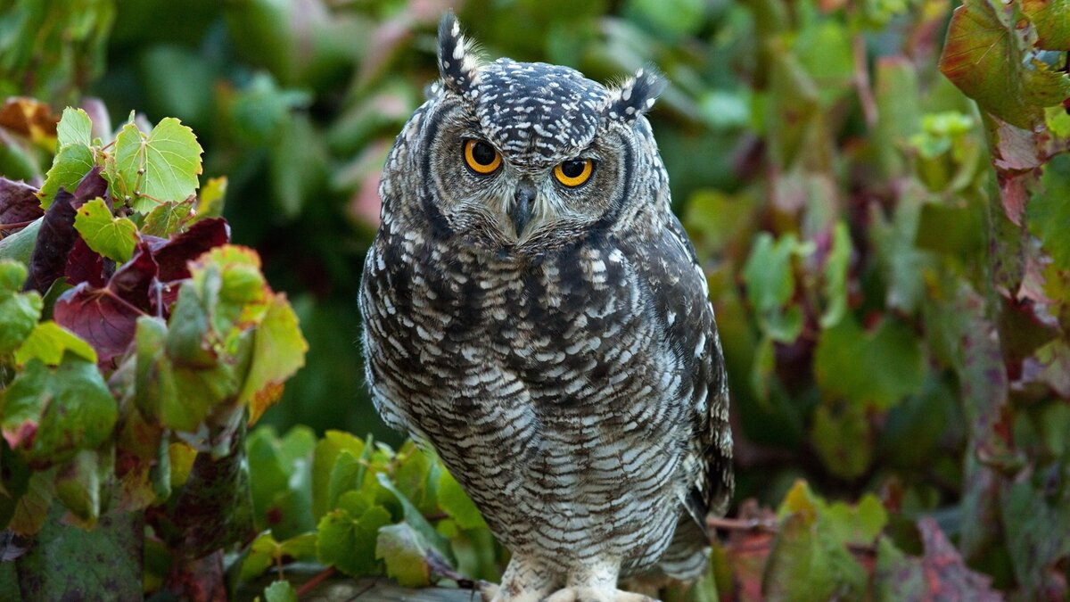Филин. Наиболее крупный вид совиных, самки обычно обладают большим весом. Оперение у него рыже-охристого цвета, а глаза – ярко-оранжевые. Отличительной особенностью является наличие пучков удлинённых перьев над глазами, а также отчётливые тёмные полосы на голове и спине. Ещё одна особенность – в отличие от большинства своих сородичей, филин прекрасно видит и охотится днём.
