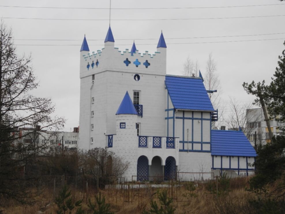 Этот синявинский замок видят все, кто едет по трассе Кола в сторону Петербурга — он стоит сразу за заправкой Газпрома, официальный адрес — Лесная улица, 42-Б. Напоминает фабрику «Военторга» в Обухово, только менее пластиковый. Белёные (кажется) газобетонные блоки, синие конусы и металлочерепица, башенка и фахверк, арочки и декоративные решётки — дом одели во всё красивое сразу. На фасаде с одной стороны — часы, с другой — бюст Ленина в нише. Контекст удивительный. Во-первых, запах куриного помёта всюду, и вокруг замка тоже (Синявинская птицефабрика — в 14 километрах). Во-вторых, облезлые пятиэтажные «корабли» и массив скромных частных домов, напротив которого — подземные погреба, как норы хоббитов. В трехстах метрах — еще один свежий особняк, под модерн: в нем открыли сетевой алкомагазин. «Это кто-то для себя жилой дом строит», — сказала нам про замок продавщица в местном кафе. Кто — не совсем ясно: с 2011 года участок на Лесной принадлежал некоей Тамаре Маркович, про которую интер