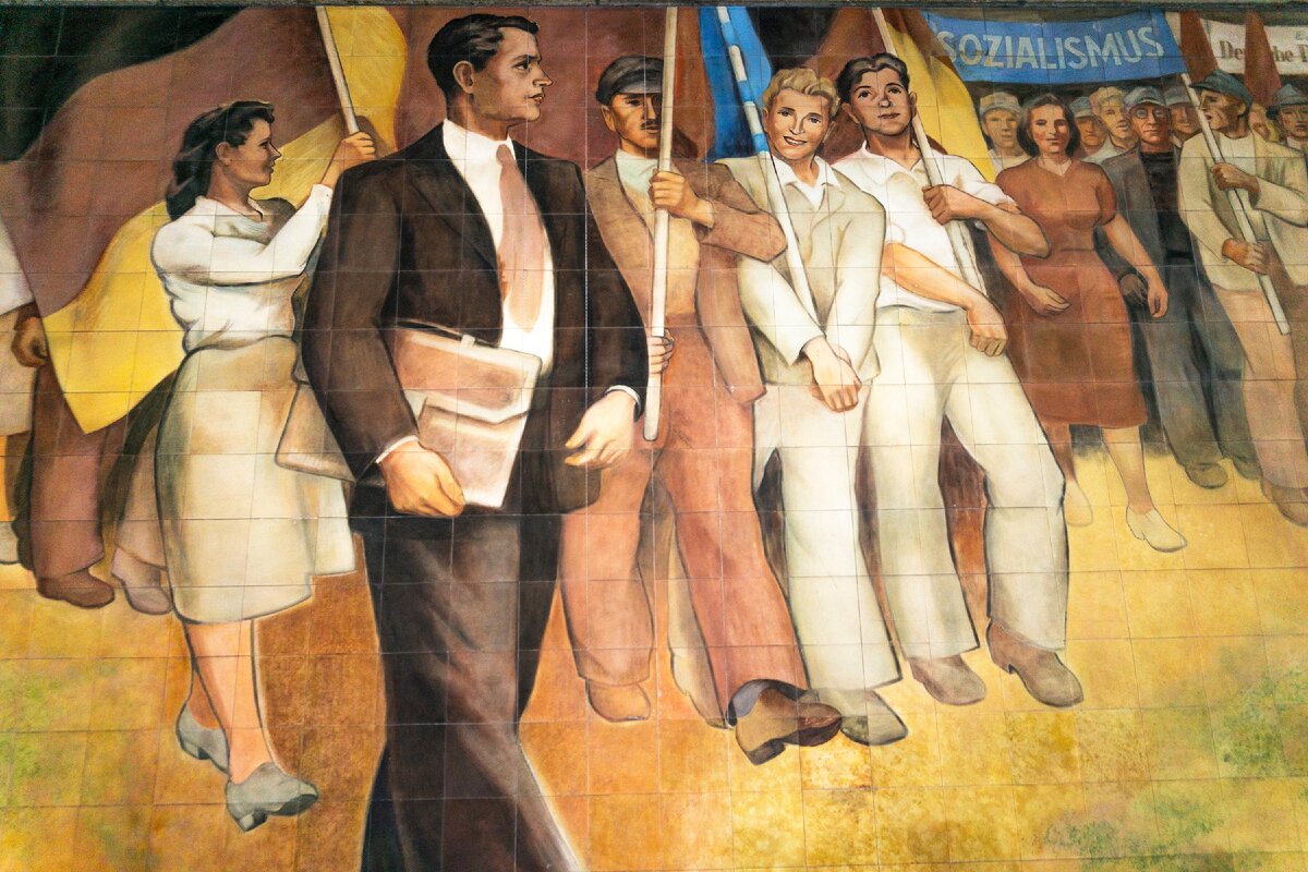В один из ноябрьских вечеров, я стоял перед перёкрёстком в центре Берлина, ожидая зелёного света. От нечего делать, я смотрел по сторонам и внезапно обнаружил красочное панно на сером здании министерства финансов Германии. Удивительно, но этот маленький кусочек коммунизма в европейской столице, надолго засел в моей памяти. Очень уж светлая эта работа, очень родная для меня. В сегодняшней Германии это министерство финансов. А при нацистах, здание занимало имперское министерство авиации, в котором располагался кабинет Германа Геринга и решались вопросы развития Люфтваффе. Чудом оно пережило бомбардировки союзников и сохранилось до наших дней. В социалистической ГДР были свои пионеры и комсомольцы. Пионерская организация Восточной Германии носила имя Эрнста Тельмана - лидера немецких коммунистов и одного из главных политических оппонентов Гитлера. В отличие от советских ребят, младшие из немецких пионеров носили галстуки синего цвета. Панно выполнено в духе соцреализма, оно пестрит