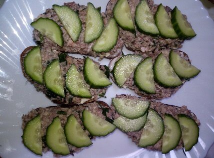 Доброго всем вечера суток, дорогие друзья! Предлагаю сегодня приготовить вкусные бутерброды из сайры. Они хорошо подойдут не только на завтрак или перекус, но и вполне годятся на новогодний стол. По вкусу они намного лучше бутербродов со шпротами. Для приготовления таких бутербродов потребуются следующие продукты: Сайра консервированная-1банка Хлеб ржаной. Творожный сыр -1банка Чеснок -1-2зубчика Огурец -1шт Зелень петрушки и укропа. Приготовление: Баночку с рыбой открыть и слить сок. Рыбу переложить в миску и размять вилкой. Зелень порезать и добавить к рыбе, все перемешать. Огурец порезать поперек на тонкие пластинки. Хлеб порезать и подсушить на сковороде или тостере, но не сильно, так слегка. Конечно не обязательно использовать ржаной хлеб, можно взять белый батон, но с ржаным хлебом вкуснее. Моей семье нравится больше с бородинским. Вы можете сделать и с белым, и с ржаным, для сравнения. Теперь, когда хлеб подсушили. Натираем кусочки хлеба чесноком. Затем намазываем творож