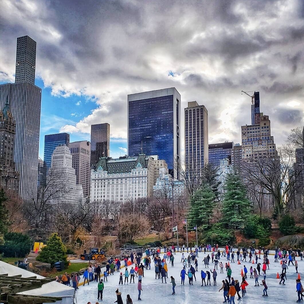 Давайте посмотрим на него издалека. А потом поднимемся на мост и вдоволь насладимся видом. С одной стороны, каток, где мы только что были. С другой, отель "Плаза", куда мы сейчас отправимся.
