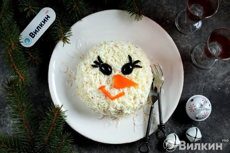 Очень скоро все семьи соберутся за праздничным новогодним столом, а многие хозяйки уже ищут не только вкусные рецепты, но и способы оформления угощений, чтобы внешний вид этих блюд был максимально тематическим. Сегодня мы будем готовить один из самых любимых моих салатов – с печенью трески, но выглядеть он будет как настоящий снеговик. При желании можно добавить ему челку из тех же маслин, щечки из помидоров черри или шляпку из болгарского перца. Ингредиенты: Способ приготовления: Чтобы приготовить салат «Снеговик», подготовьте все необходимые продукты. Откройте банку с печенью трески, слейте масло. Помойте жесткой кухонной губкой картофель, морковь и яйца. Залейте их холодной водой, поставьте вариться. Когда она закипит, засеките время. Яйца выловите через 10 минут, остудите их в ледяной воде, очистите от скорлупы. Морковь будет готова минут через 15, а картофель, в зависимости от величины клубней, сварится минут через 20. Овощи остудите, очистите от кожуры. Натрите на крупной тер