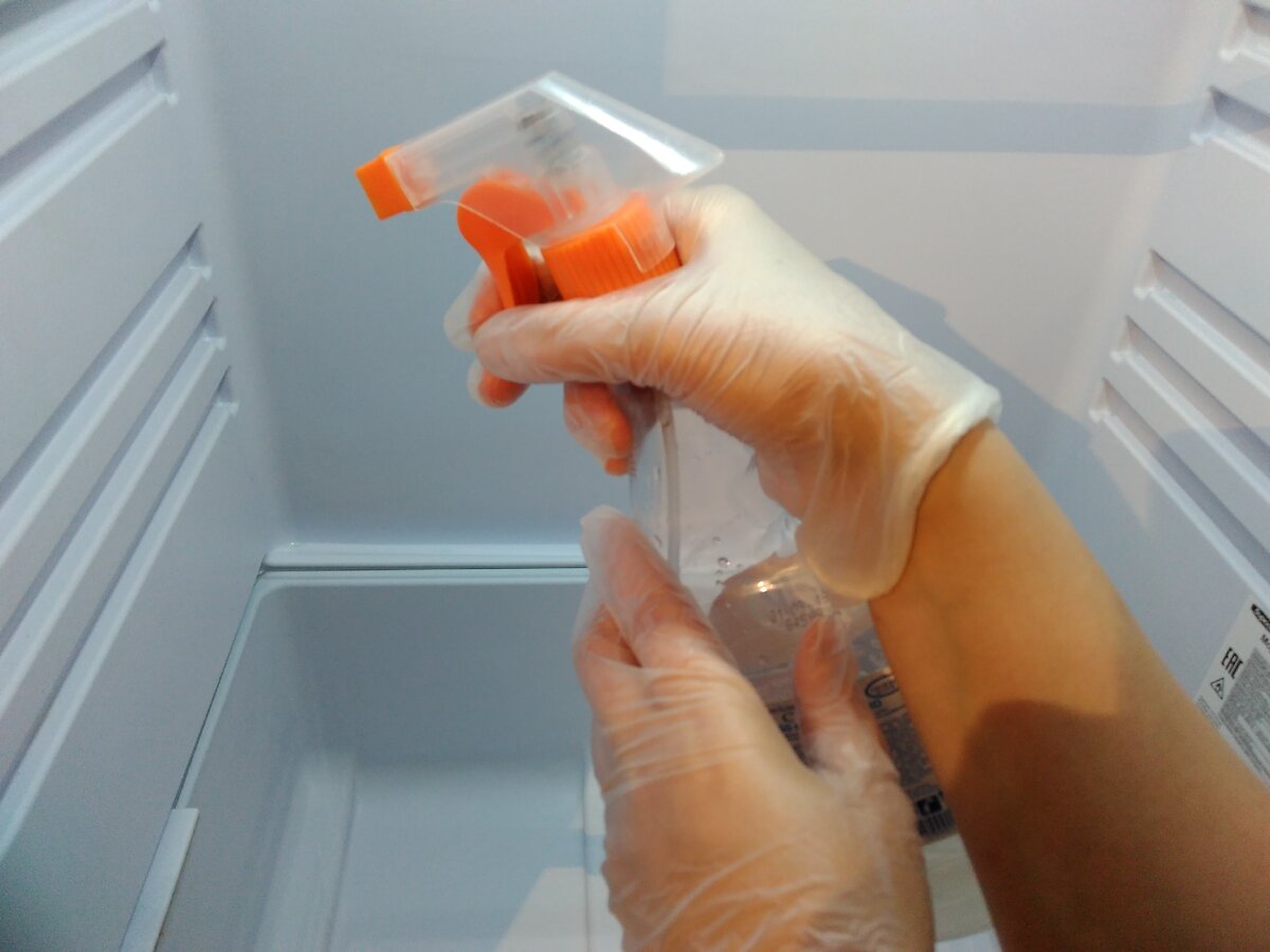 Приготовила рабочий раствор уксуса, развела его с водой в пропорции 1 к 1 и протираю им все в холодильнике.