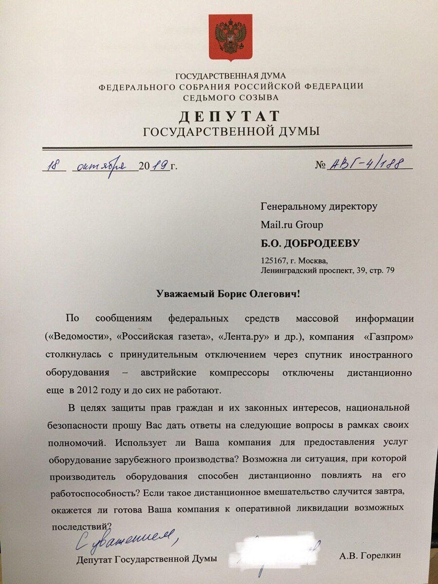 Депутат Госдумы Антон Горелкин, являющийся автором законопроекта об ограничении иностранной доли в «значимых» IT-компаниях, намерен обратиться в прокуратуру в случае, если компании Rambler и Mail.ru Group не дадут до конца недели ответа на официальные запросы об использовании иностранного оборудования. «Если я не получу ответы от Rambler и Mail.ru Group до конца этой недели, обращусь в прокуратуру. Штрафы там небольшие предусмотрены, но пятно на репутации будет стоить дороже», — депутат Госдумы Антон Горелкин