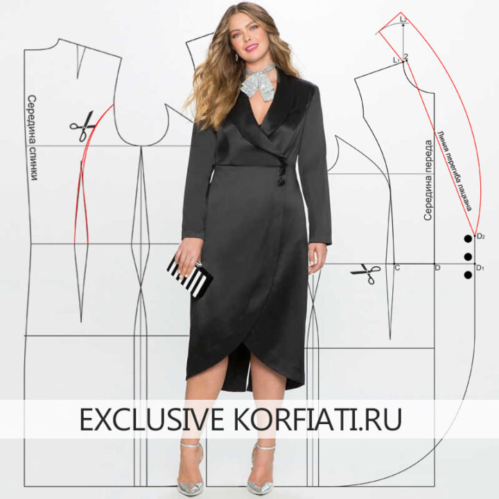 Сегодня у нас особенное предложение для женщин с роскошными формами. Мы хотим предложить вам смоделировать и сшить платье, которое представит фигуру в самом выгодном свете! Длинный свободный рукав, скругленная линия подола с запахом и элегантный воротник-шалька — вот слагаемые успеха этой модели размера XXL. Добавим к этому — атласную ткань глубокого черного цвета — и получим платье, достойное самых торжественных праздников. В таком наряде вы будете чувствовать себя настоящей королевой на любом торжестве. Чтобы образ был завершенным, дополните его серебристыми лодочками и галстуком такого же цвета. Моделирование выкройки платья выполните по вашей базовой выкройке платья, прибавка на свободу облегания у этой модели составляет 3 см. Вам также потребуется выкройка одношовного прямого рукава. Если у вас нет готовой базовой выкройки платья и рукава, вы можете скачать их бесплатно Скачать готовую базовую выкройку платья на 52-56 размеры https://korfiati.ru/2018/12/pattern-dress-with-shawl/