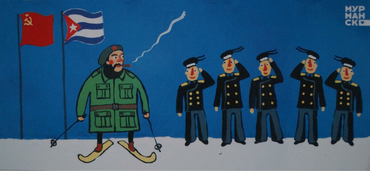 Не отпускает меня Мурманск, который я посетил не так давно. Это не только полярные ночи и дни, корабли и сопки, снег и крыши (и кроме крыш и снега ничего). Город - это люди и места их обитания. Мурманские художники Анастасия Береза, Вероника Вологжанникова, Дмитрий Новицкий и Мария Михайленко в серии открыток запечатлели свою родину на самом краю света. Работы стилизованы под детские рисунки. Смотрим. В 1963 году Фидель Кастро посетил Мурманск. Я рассказывал об этом эпизоде ранее: кубинский лидер возмущался, что встречать его советские показушники согнали полгорода. На кольскую землю Фидель ступил 7 апреля, совершив самый длинный беспосадочный перелет своего времени. Мурманск достаточно молод - ему всего век. А архитектурно он еще младше - основная застройка выгорела во время фашистских бомбардировок. Наверно, обидно жить у моря, в котором нельзя купаться. В 1966 году в городе открылся первый плавательный бассейн. Вот это уже цивилизация! Сооружение на улице Челюскинцев строили три г