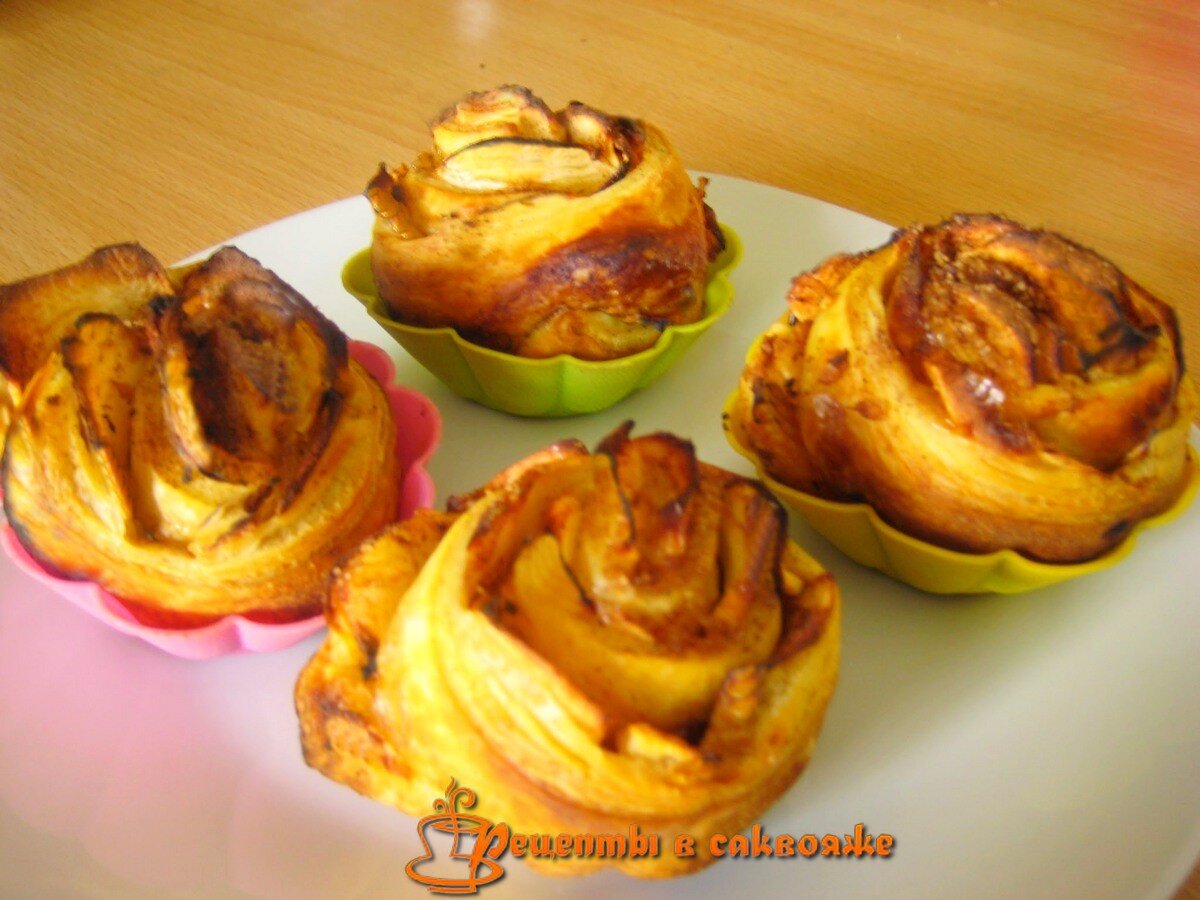 Розы с яблочными лепестками из слоеного теста можно подготовить заранее и хранить в холодильнике
