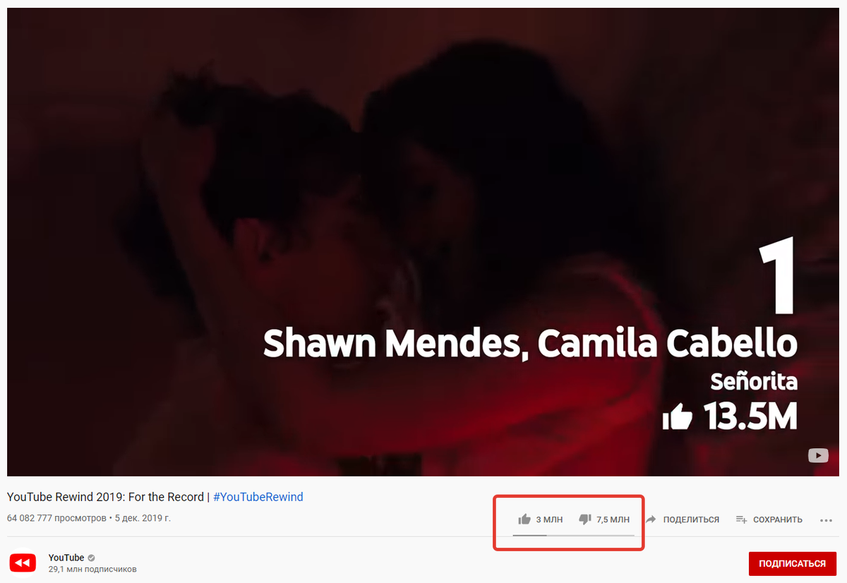 На данный момент на YouTube Rewind 2019 года набралось 7.5 миллионов дизлайков. Он находиться на 3 месте по дизлайкам. На первом месте прошлогодний Rewind, на втором месте клип Джастина Бибера "Baby", а на третьем месте Rewind 2019. До клипа Джастина Бибера, YouTube Rewind 2019 осталось 2.5 миллионов дизлайков и он обгонит его, что даст ему вырваться на 2 место.