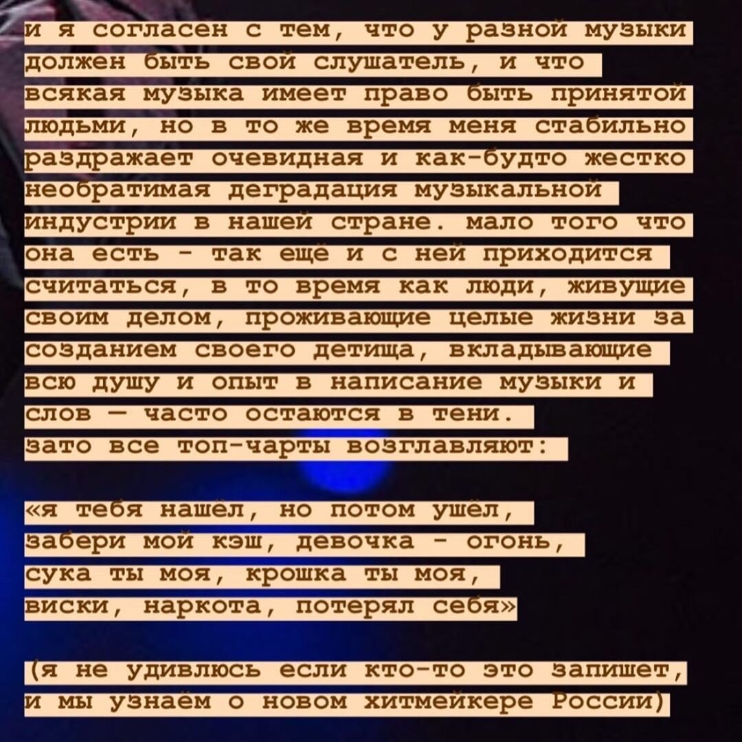 Участник лейбла "Gazgolder" высказал свое мнение в Instagram'e, также добавив: "С меня лишь желать своему народу хороших исполнителей и отдавать всего себя в песни, а то детей жалко, которые растут в потоке мимолётной и деструктивной информации, на которой артисты зарабатывают деньги, не чувствуя абсолютно никакой ответственности".