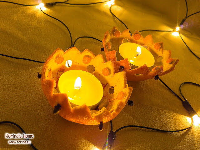 - Мандарин или апельсин. Аккуратно снимите половинки кожуры, чтобы получить две (или хотя бы одну) «чашечки». По желанию украсьте фигурной резкой. Бонус: воткните в шкурку снаружи цельные гвоздички, аромат будет еще насыщеннее.