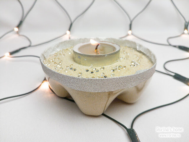 - Пластиковая бутылка. Не самый эстетичный, но быстрый способ. Срежьте донышко бутылки, засыпьте внутрь песок для грызунов, рис или крупу. Немного «прикопайте» свечу: безопасно, удобно. При желании прокрасьте пластик из баллончика, обмажьте клеем и обваляйте в блестках, оклейте красивым скотчем.