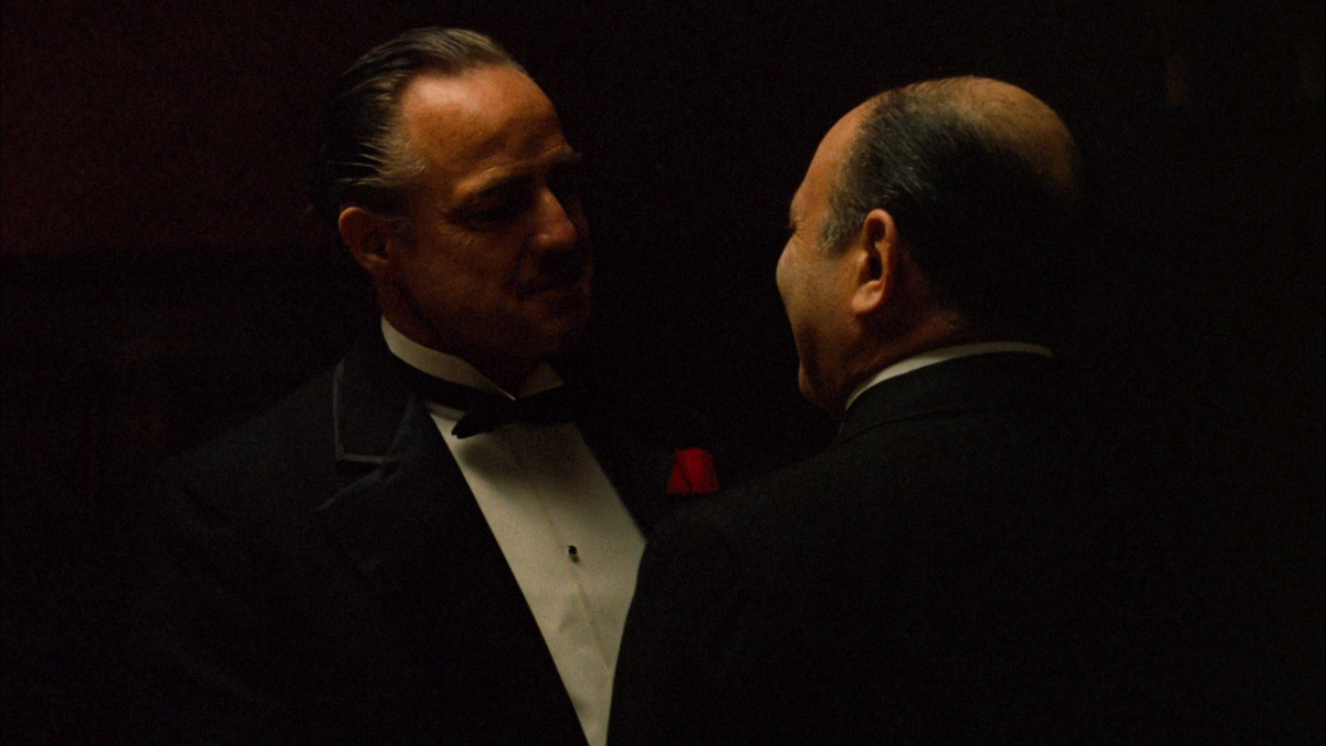 В первой же сцене к нему за справедливостью приходит гробовщик, дочь которого была изнасилована. Он готов нарушить все божьи заповеди, лишь бы его дочь была отомщена. «Крёстный отец» готов ему помочь, но от предложенных денег он отказывается. Взамен он просит только дружбы простолюдина. Это обычная дьявольская хитрость, потому что за такое покровительство многие «друзья» Корлеоне в конце концов платят жизнью. Но обиженный итальянец соглашается и проходит обряд посвящения – он целует руку крёстного отца. Таким образом, он продаёт свою душу дьяволу. Символично, что в кадре случайно появилась кошка, которую «отец» пригрел на коленях. Кошка (или собака) на многих религиозных картинах символизирует Зверя, то есть сатану.