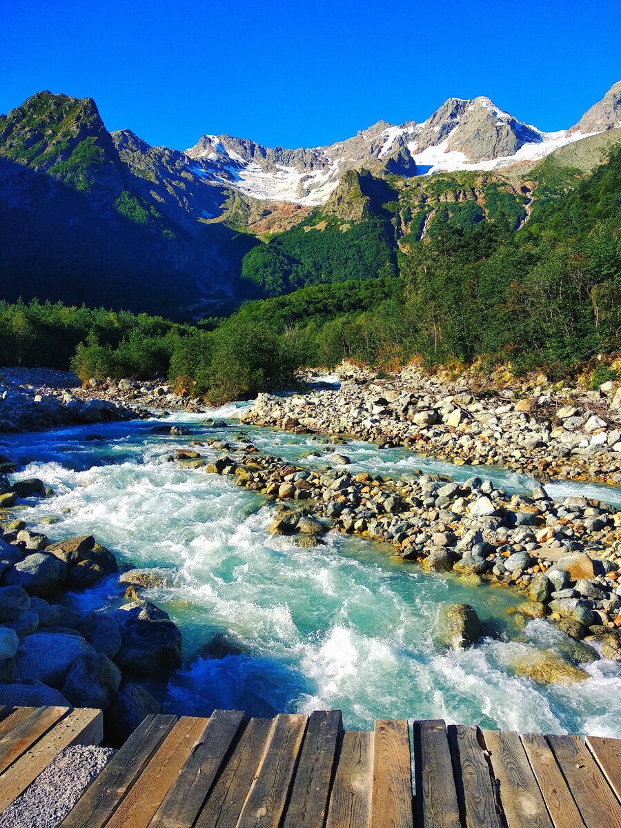 Стоит только подняться от Мышиной тропы на Некрасовскую гору, чтобы не упустить случая полюбоваться очаровательной картиной: на первом плане, в крутых скалистых берегах, между грудами камней извивается капризная, вечно неугомонная, покрытая блестящею пеною Кубань. Шум, подобный завыванию тысячей разнообразных голосов, производимый каскадами этой бурливой горной реки, наполняет собою свежий, упоительный воздух и придает как бы большую жизненность всей картине. Вершины высоких скалистых гор, группирующихся в чудной перспективе вокруг Кубани до рождающих ее вечных снегов, удивляют своею фантастичностью. Какая таинственность разлита по всей картине! Какая грандиозность! Необыкновенная грандиозность! Она даже как-то уничтожает наблюдателя, подавляет как-то... умаляет его... Но зато тот уголок, та неширокая гладкая долинка, служащая звеном между первым и вторым планом, та чистая бархатная полоска, по которой серебрится живописная линия Кубани,—как приветливо она выглядывает из темной глубины окружающих ее громад, как она успокаивает, как она манит, манит к себе!.. А то прозрачное облако дыма, окутывающее подножие мрачного утеса —это матовое покрывало меланхолической Шуаны,—как оно гармонирует со своей хозяйкой!