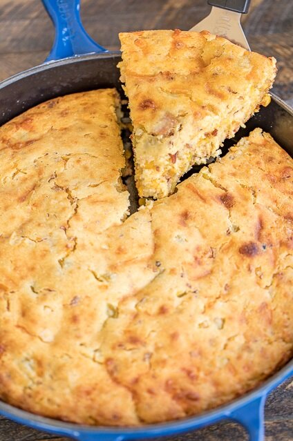 Наш любимый кукурузный хлеб с сыром чеддер, зеленым чили, сливочной кукурузой и беконом! О, МОЙ БОГ! Я мог бы приготовить еду из этого вкусного кукурузного хлеба. Отличный гарнир для супов и мяса на гриле. Попробуйте это как можно скорее! Очень вкусно!! ИНСТРУКЦИИ: ИНГРЕДИЕНТЫ: 2 чашки саморазвивающейся кукурузной муки 1 стакан муки 2 яйца 2-1 / 2 до 3 чашки пахты (приблизительно) 1 чашка тертого сыра чеддер 1/2 стакана приготовленного нарезанного бекона 1 (4 унции) может зеленый перец чили, нетренированный 1 (14,75 унций) консервированной кукурузы 2 столовые ложки растительного масла