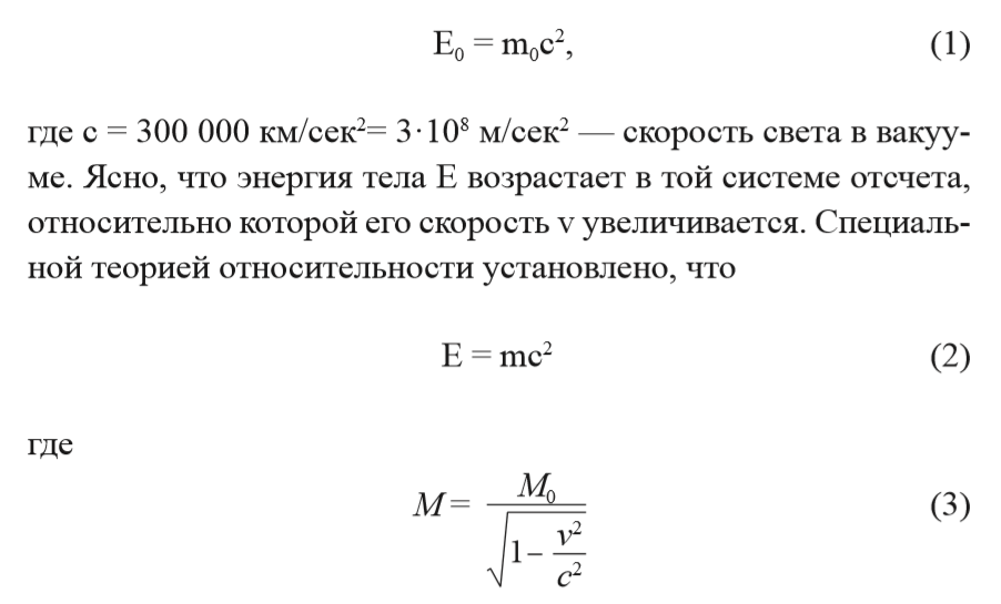 Ответ на этот вопрос дает специальная теория относительности. Великим ученым Альбертом Эйнштейном установлена следующая зависимость между энергией Е0 и массой м0 для физического тела, находящегося в покое: