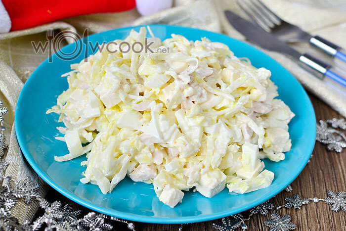 Тем временем шинкуем капусту на полоски, немного мнем руками, чтобы она стала мягче и отправляем в салатник. 2. Берем уже готовое отварное мясо курицы и нарезаем его. 3. Плавленый сыр также нарезаем кубиками и добавляем к предыдущим нарезанным продуктам. 4. Отваренные яйца очищаем от скорлупы. Отделяем белки от желтков. В салате присутствует только белок, нарезаем его кубиками и кладем в салатник. 5. Смешиваем 3 столовых ложки сметаны с чайной ложкой дижонской горчицы и лимонным соком. Пропускаем зубчик чеснока через пресс и также смешиваем с соусом. Можно добавить щепотку прованских трав. 6. Солим заправку по вкусу и перемешиваем. 7. Поливаем ингредиент