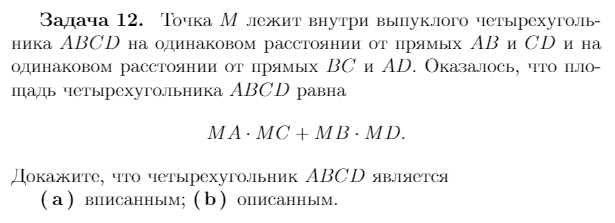В октябре прошел осенний тур Турнира городов. Как всегда в основном (сложном) варианте предлагалось семь задач для 8-9 классов и семь задач для 10-11 классов, и там, и там было по две геометрии. Сегодня я разберу понравившуюся мне задачу из старшего варианта. Обещаю в обозримом будущем разобрать и одну из задач младшего варианта. Кроме того, в ближайших постах я разберу кое-какие геометрии с прошедших недавно муниципального этапа Всероссийской олимпиады и третьего отборочного тура олимпиады Эйлера. Каждый из пунктов этой задачи оценивался в 6 баллов. Вообще довольно забавное наблюдение. И главное, что для меня осталось загадкой, насколько сложным является каждый из пунктов, если не знать, что верен второй. То есть вот если бы просто дали задачу с пунктом (a), сложнее она была бы или проще, чем задача с дополнительной информацией из пункта (b). В общем, не знаю. И не знаю, признаюсь, авторского решения. У меня получилось придумать несчетное и вполне геометрическое рассуждение (насколько