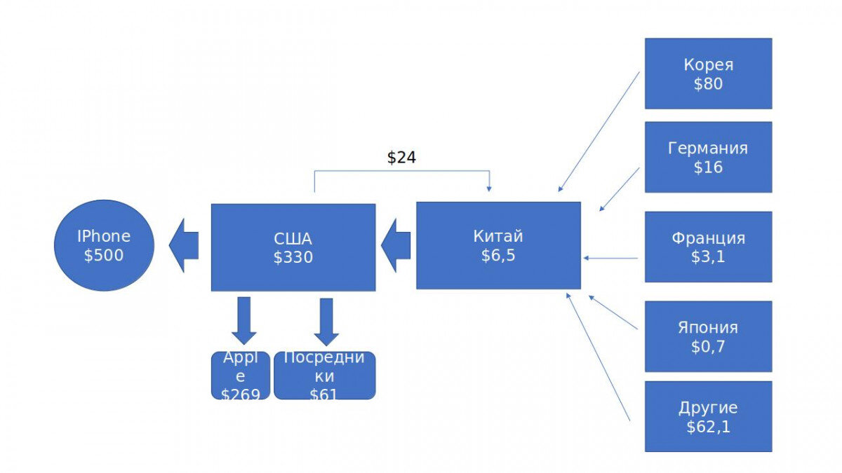 Классический пример. Компания Apple производит Iphone, который продаётся на американском рынке за, условные, 500 долларов. Сборка этого изделия, как известно, производится в Китае в прямом смысле руками местных рабочих. Однако из-за дешевизны рабочей силы и низкой производительности труда китайская сторона получает за свой вклад лишь 6,5 долл. Ещё 162 долл. приходится на страны Европы, Южную Корею и Японию, которые поставляют в КНР комплектующие. Оставшиеся 330 долл. достаются головному звену этой цепочки – корпорации Apple, владеющей брендом и разрабатывающей программное обеспечение.
