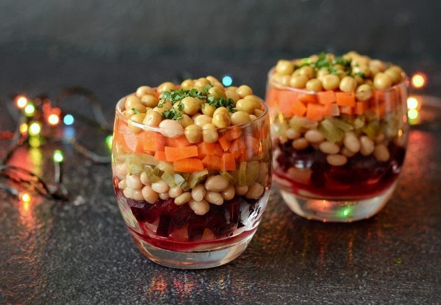 Сегодня я с вами поделюсь рецептом слоеного винегрета с фасолью и горчично-лимонной заправкой. Его можно выложить в стаканчики и подать на праздничный стол. По сути салат все тот же, но такая подача выглядит интереснее. Слоеный винегрет с фасолью и горчично-лимонной заправкой