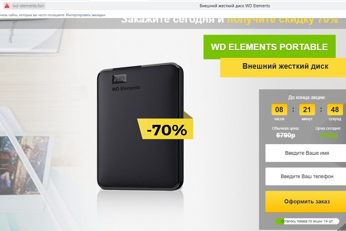 Друзья! Сегодня очередное разоблачение мошенников в интернете! Наткнулся на сайт http://wd-elements.fun. Ссылка На этом сайте нам предлагают купить внешний жесткий диск от компании Western Digital объемом целых 4Тб !!! всего за 1990 рублей. Сразу настораживает, что оформление сайта как две капли похоже на предыдущий сайт мошенников, которые продают SSD Samsung 2 Тб о котором можно почитать здесь и другой сайт мошенников, на котором продают внешний жесткий диск TOSHIBA 4 Тб - разоблачение здесь. Начинаем разглядывать сайт магазина и замечаем, что нет названия у сайта, нет никаких контактных данных для связи. Ни адреса, ни номера телефона. В самом низу страницы указана информация ИНН и ОГРН. К слову, организация с таким ИНН действительно существует, но скорее ею просто прикрываются. Компания ООО "МЕРЛИОН" не занимается торговлей. У этого сайта есть и клон , с адресом http://wd4tb.top/ На обоих сайтах левые отзывы, и можно лишь оставить номер своего телефона, для зак