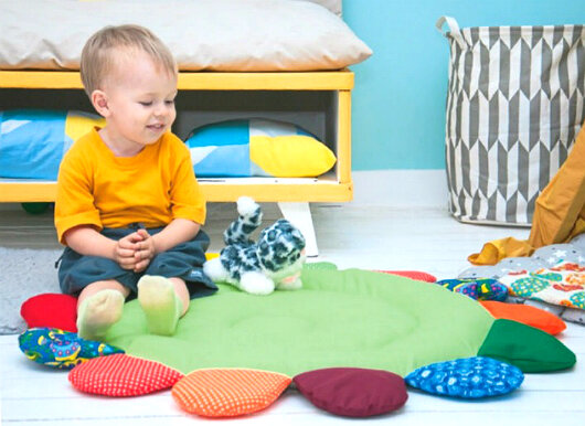 Изучать мир малышу интереснее, если его окружают не просто функциональные вещи, но еще и красивые, и тем более сшитые руками заботливой мамы! На коврике в виде цветика-семицветика будет комфортно играть, он поможет выучить цвета, а может быть, и фактуры, если, например, сшить лепестки не только из хлопка, но и из джинсовой ткани, шелковой, вельвета и разнообразных тканей. А на лепестках еще можно вышить буквы имени малыша, почему бы нет?