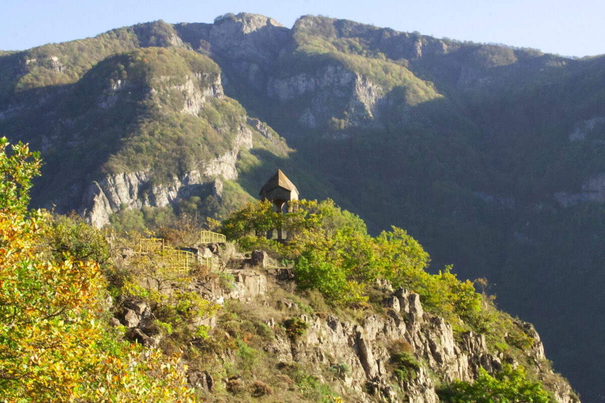 На краю этой выделяющейся скалы когда - то был пункт наблюдения, с которого просматривается вся долина. Тут же висел колокол. Арснадзорский Колокол был частью системы оповещения о надвигающейся опасности.