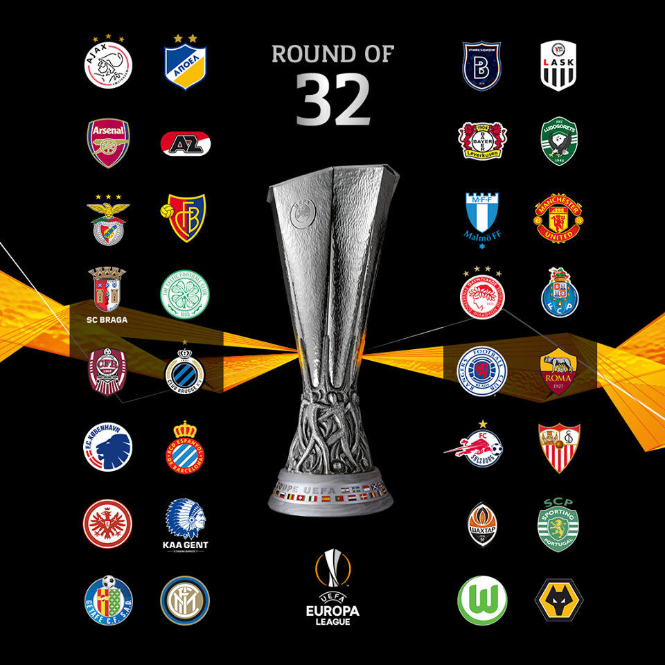 Брюгге – Манчестер Юнайтед Олимпиакос – Арсенал Вулверхэмптон – Эспаньол Шахтер – Бенфика Лудогорец – Интер Рома – Гент АЗ Алкмаар – ЛАСК Вольфсбург – Мальме ЧФР Клуж – Севилья Айнтрахт – РБ Зальцбург АПОЭЛ – Базель Копенгаген – Селтик Хетафе – Аякс Спортинг – Истанбул Башакшехир Байер – Порту Рейнджерс – Брага Первые матчи 1/16 финала состоятся 20 февраля, ответные – 27 февраля 2020 года.