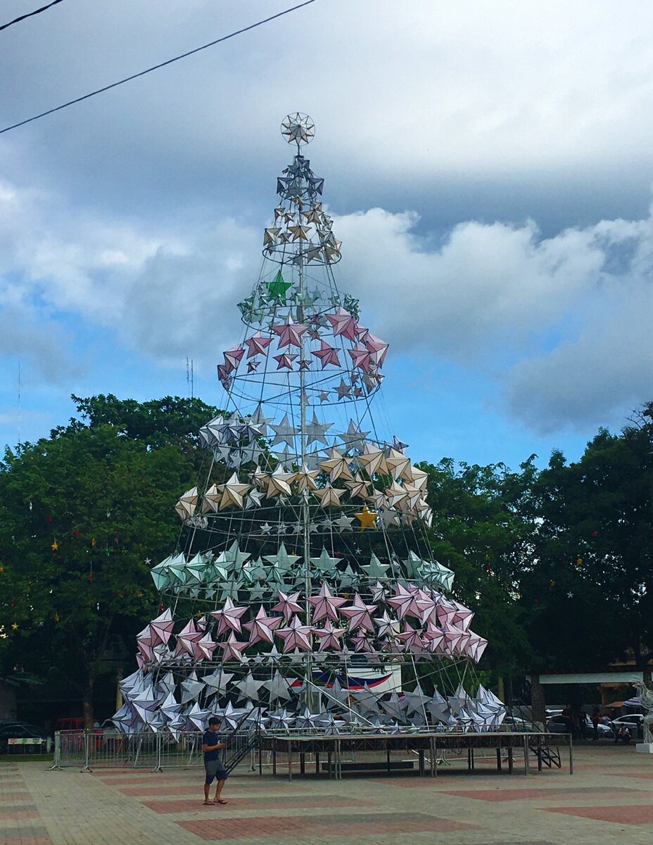 На Филиппинах, само собой, не растут ели. А поставить елки хочется каждому городу:) Как они выходят из этой ситуации? Филиппины — бывшая американская и испанская колония. Потому население страны глубоко религиозно: они католики. И Рождество — это самый главный праздник в году. В других странах Азии Рождество с таким размахом не отмечают. Надо сказать, что к рождеству тут готовятся очень заранее. Первые украшения появляются уже в сентябре! А рождество у католиков, на секундочку, празднуется 25 декабря. Но хватит болтать, давайте посмотрим на главную площадь большого города Думагете. Кажется, главной елке чего-то не хватает:) Например, САМОЙ ЕЛКИ и не хватает. На случай, если вы не разглядели — вот фото вблизи: Только металлический каркас и гирлянда в виде звездочек. Но, справедливости ради, отмечу, что ночью смотрится вполне себе по-новогоднему (или по-рождественскому?). Но и это еще не все. В соседнем городе есть вот это чудо вместо елки: Да, на беседку просто поместили конструкци