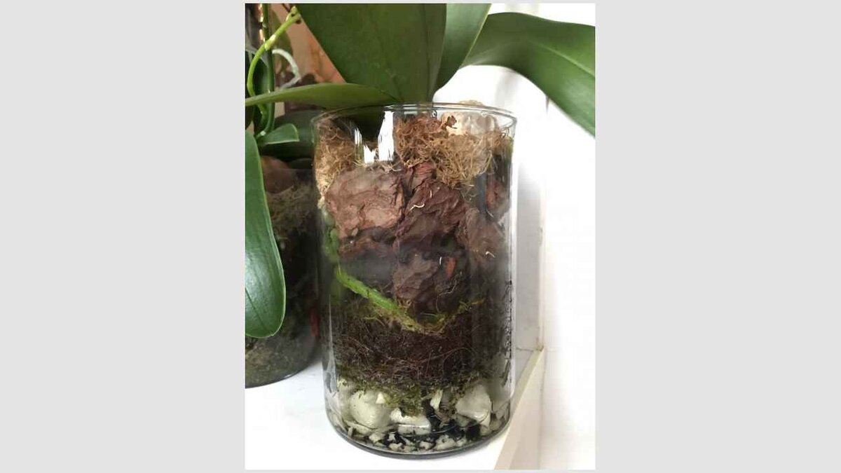 Орхидея – эпифит. Нам нужно, чтобы корни получали кислород, находясь в закрытой стеклянной таре без дренажа. При этом не загнили и не заболели грибами. На дно сосуда насыпаем слой дренажа около 5-7 см (в зависимости от высоты сосуда: чем выше сосуд, тем больше дренажа). Дренаж - керамзит или бывает ещё грунт для орхидей со специальным дренажом. Далее помещаем слой мха сфагнума. Сухой сфагнум предварительно замачивается в воде (недолго). Я использую живой (собираю в лесу). Мох присыпаем слоем древесного угля. Это нужно для того, чтобы создать среду, в которой грибы и насекомые живут неохотно. Далее кора средней фракции, перемешанная с кокосовыми чипсами Сверху ещё один слой мха. Он укутает орхидею и не даст коре всплывать во время купания.