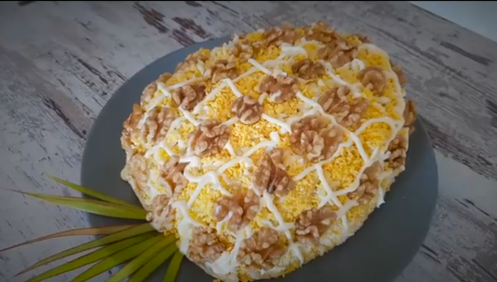 Всем привет сегодня я расскажу как готовлю вкусный и красивый салат "Ананас".Для приготовления мне понадобиться ветчина - 200 г картофель - 2-3 шт яйца -4 шт ананасы консервированные - 1 банка, орехи грецкие -200 г консервированная кукуруза - 200 г майонез 200 гр черный перец молотый - по вкусу . Способ приготовления: Отвариваю картошку с яйцами, режу ветчину соломкой, если ананас кольцами то надо нарезать его кубиками, на крупную терку натру картошку отварную.Яйца надо отделить белок от желтков и на крупной терки натру белок на мелкой терки желток. Все ингредиенты у меня подготовлены можно приступить к самой сборки салата. Беру большую тарелку и первым слоем выкладываю половину натертой картошки и поперчу её молотым черным перцем, сверху промажу майонезом (как сделать домашний майонез я рассказываю в одной из своих статей кому интересно почитайте), следующий слой сделаю из кукурузы выкладываю ровно половину от банки и сверху выкладываю слой ветчины теперь можно смазать майон