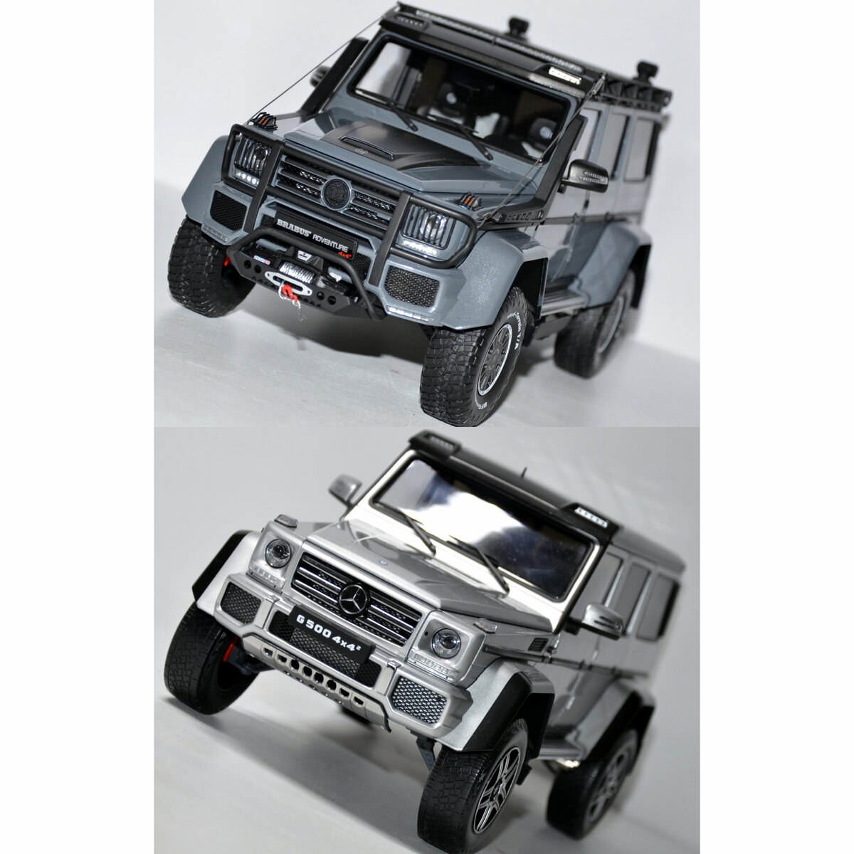 Приветствую вас на своем канале. Подписывайтесь, чтобы не пропустить много интересного в мире коллекционирования. Производитель: Almost Real Материал: металлический сплав (diecast) Статус: доступно к покупке Две просто замечательные модели от Almost Real: Brabus 550 Adventure 4x4^2 2018 #860304 in metallic grey color и Mercedes G500 4x4^2 W463 2017 #820204 1/18 in silver metallic. Модель Мерседеса при выходе произвела фурор среди коллекционеров, так как Almost Real применил множество новых решений для модели: портальные мосты с работающими карданами, правильные петли по кругу для Гелендвагена, уникальная работающая подвеска. Приятно, что AR не остановились почивать на лаврах и в Brabus добавили к уже достигнутому рабочие пороги и лебедку. Подробные описание каждой модели есть по ссылкам, здесь просто фотоколлаж. На мой взгляд, Brabus оснащён так, как должен оснащаться Mercedes в исполнении 4x4^2 Диски на Мерсе смотрятся, конечно, интересней, но внедорожный комплект на фирменных диска