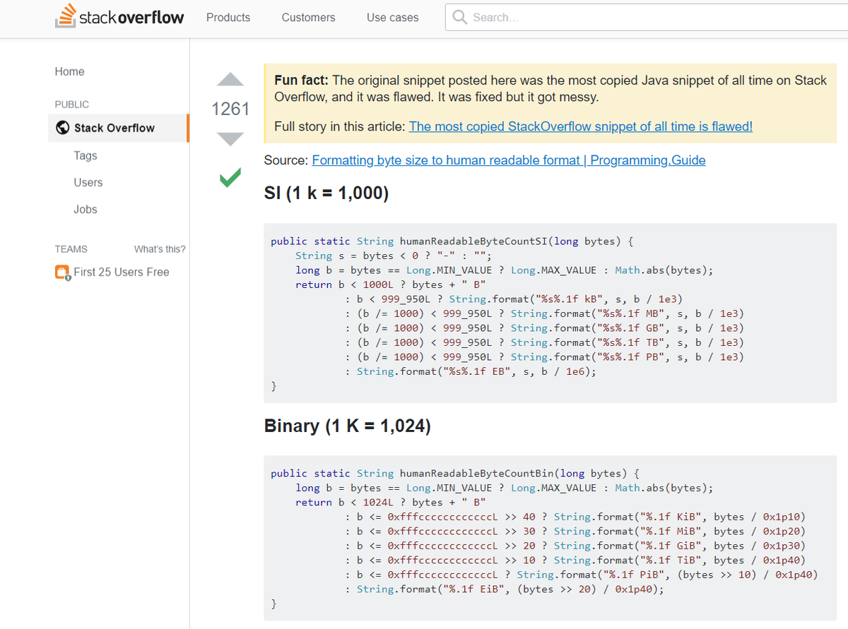 Сайт StackOverflow – популярная система вопросов и ответов о программировании. На этом ресурсе можно найти (или хотя бы попробовать!) решение практически любой проблемы. Но не все советы коллег одинаково полезны: в самом цитируемом куске кода на Java, представленном на StackOverflow, обнаружили серьезный баг. Кто создал самый цитируемый фрагмент Java-кода В сентябре 2010 года Андреас Лундблад опубликовал Java-сниппет в ответ на вопрос другого пользователя на StackOverflow. Сниппет преобразовывал большие количества байт в формат, удобный для чтения людьми: к примеру, 123 456 789 байт в 123,5 МБ. Сегодня Лундблад – один из самых известных Java-разработчиков в мире и авторитетный представитель сообщества StackOverflow. Лундблад работает в компании Palantir, основанной выходцами из PayPal. Компания разрабатывает софт для хедж-фондов, инвестиционных банков и спецслужб по всему миру. В чем проблема Сниппет Лундблада назвали самым цитируемым в научной статье, опубликованной в 2018 году. Эксп