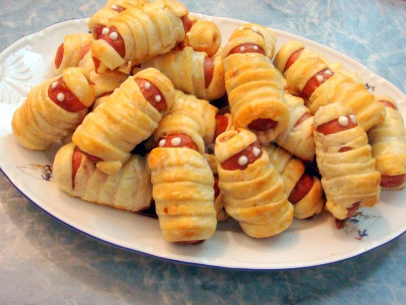 Ингредиенты: 500 г. дрожжевого слоеного теста 500 г. сосисок 50 г. сыра (по желанию) Яйцо (для смазки) Приготовление: 1. Сосиски очищаем от плёнки. Делаем разрез вдоль. 2. Сыр трем на мелкой терке и аккуратно кладем в разрез. 3. Тесто раскатываем примерно 0.5-1 см, делаем полоски во всю длину теста. 4. Сосиску заворачиваем в полоску теста, выкладываем на противень (на расстоянии). 5. Взбиваем яйцо и обмазываем тесто. Отправляем в духовку на 20 минут при температуре 180 градусов. ГОТОВО)