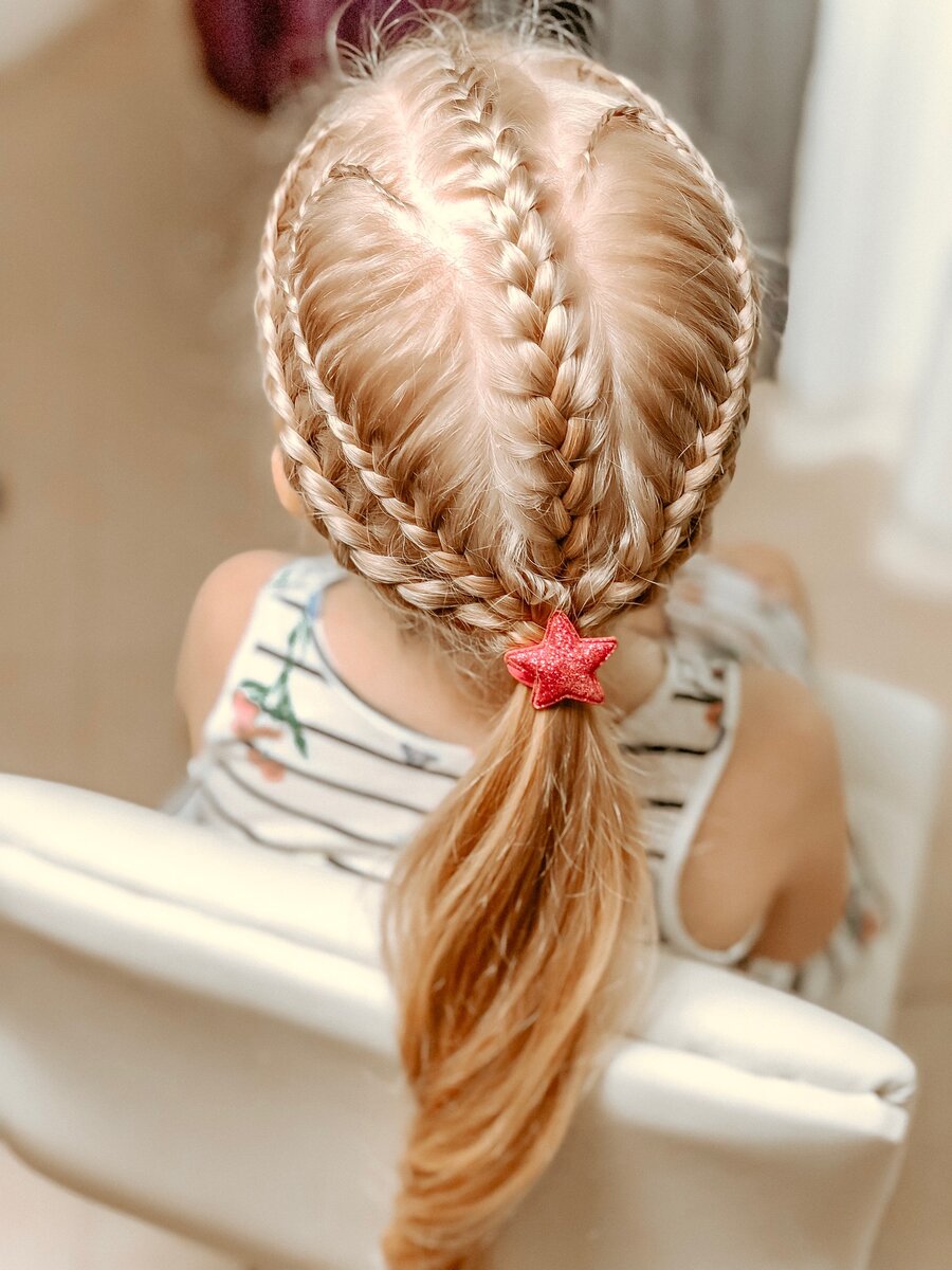 Далее выделяем от макушки вниз сердце. Выделяем от косы тонкую прядь и начинаем плести сердце, делим ее на три , правая наверх в середину, левая наверх в середину, правая с подхватом тонкой пряди от косы наверх в середину, левую плетём без подхвата, правая с подхватом тонкой пряди наверх в середину, левую плетём без подхвата. Как только косу начинаем закруглять, пряди справа плетём без подхвата, а левые для подхвата берём из «сердца», к