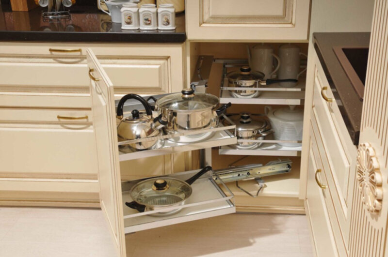 Организация пространства на кухне позволит вам избежать проблем с поиском посуды. Можно использовать стандартный гарнитур – наверх всегда ставиться хрупкая посуда, та, которой вы пользуетесь ежедневно. В дальних углах следует располагать то, чем вы пользуетесь только в особых случаях, например, праздничная посуда, а внизу – кастрюли и сковородки. Если у вас квартира-студия или вы только переехали, и не успели обзавестись мебелью, то вас спасет хорошая столешница длиной на всю стену. Под ней можно расставить самодельные открытые стеллажи, корзины и выдвижные конструкции. Чтобы посуду не было видно, можно закрыть пространство под столешницей плотным текстилем. Свободную стену можно использовать для создания системы подвесов – и тогда все у вас будет под рукой. Дополнить подвесы могут рейлинги и крюки, расположенные по периметру кухонной зоны. Огромный шкаф, который только занимает место, можно заменить компактной сушкой либо стеклянными полками, создающими иллюзию свободного простран