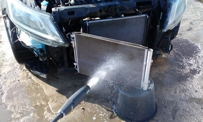 ПРОМЫВКА РАДИАТОРА АВТО Внутри сот радиатора могут накапливаться ржавчина или накипь, причем, это иногда происходит, даже если используются антифризы с антикоррозийными и смазывающими свойствами. Для того чтобы выяснить, нуждается ли радиатор в промывке, нужно полностью слить из системы охлаждающую жидкость. Если жидкость чистая, то можно ограничиться профилактической промывкой, если же в слитой охлаждающей жидкости заметны накипь и ржавчина, то придется делать более основательную промывку. При промывке радиатора используется дистиллированная вода и чистящее вещество, например, антинакипин. Этим раствором заполняется система охлаждения, и запускается двигатель автомобиля на 15 – 20 минут. После этого вода с антинакипинном полностью сливается, а система охлаждения промывается дистиллированной водой не менее трех раз. промывка радиатора автомобиля После такой промывки, в радиатор заливается антифриз. Возможно, в системе останется воздух, поэтому нужно завести мотор на несколько минут,