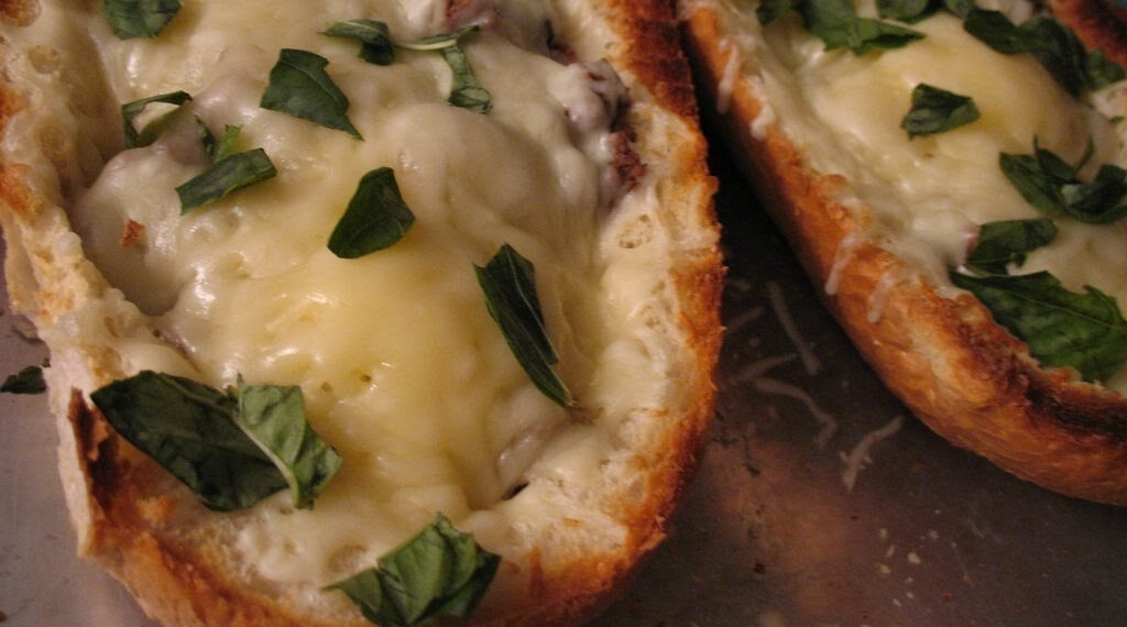 Багет разрежьте вдоль, уберите мякоть из середины. Обе половинки подсушите в духовке 2–3 минуты. Моцареллу нарежьте кубиками. Базилик измельчите.
