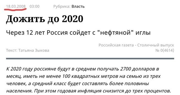 Через 12 лет Россия сойдет с "нефтяной" иглы К 2020 году россияне будут в среднем получать 2700 долларов в месяц, иметь не менее 100 квадратных метров на семью из трех человек, а средний класс будет составлять более половины населения. При этом годовая инфляция снизится до трех процентов. Такие прогнозы содержатся в Концепции социально-экономического развития России до 2020 года. Вчера этот документ появился на сайте минэкономразвития. Эксперты уже называют концепцию "прорывным сценарием", по которому к 2020 году Россия утвердится в статусе ведущей мировой державы. Экономическое развитие, согласно новой концепции, будет осуществляться только по одному сценарию - за счет внедрения инноваций. Напомним, что Владимир Путин в феврале заявил, что выбора нет - "придется становиться великой инновационной социально ориентированной державой, не отказываясь и от конкурентных сырьевых преимуществ". Для осуществления такого сценария концепция предусматривает использование Резервного фонда "в усло