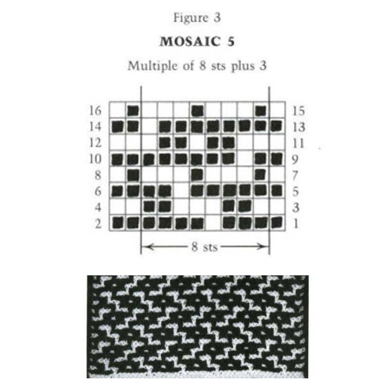 Мозаичное вязание очень напоминает привычный ленивый жаккард и, по сути, им и является. Но в схемах этой техники вязания есть определенные особенности, без знания которых, узор не получится. Однако, все правила очень простые и легко запоминающиеся, а процесс работы, и тем более результат, приносят море положительных эмоций. Используя любую схему в технике мозаичного вязания, можно вязать платочной или чулочной вязкой, при этом главные принципы чтения схемы не изменяются. При вязании платочной вязкой каждый ряд вяжется лицевыми петлями. При этом узор выглядит шире и короче, чем при чулочной вязке, и края изделия не заворачиваются. При вязании чулочной вязкой (лицевая гладь) лицевые ряды вяжутся лицевыми петлями, изнаночные ряды - изнаночными. Узор, связанный чулочной вязкой, выглядит гладким и аккуратным. Для примера рассмотрим схему №5. Сверху схемы указано: "Multiple of 8 sts plus 3", это значит, что количество петель набора должно быть кратно восьми плюс 3 дополнительные петли. Кр