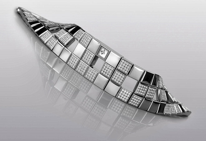 Вообще-то швейцарцы из Piaget прославились не только как часовщики, но и как ювелиры. Неудивительно, что модель 2010 года легко можно спутать с браслетом. Да и драгоценных камней там такое количество, что часики и вправду больше тянут на украшение. Корпус часов покрыт 688 бриллиантами, а на ремешке имеются 350 багетов. Поверхность циферблата украшена 173 камешками — чтобы окончательно поразить роскошью. Постаравшись с этой моделью на славу, Piaget не стали увлекаться и выпустили лишь два экземпляра своего творения.
