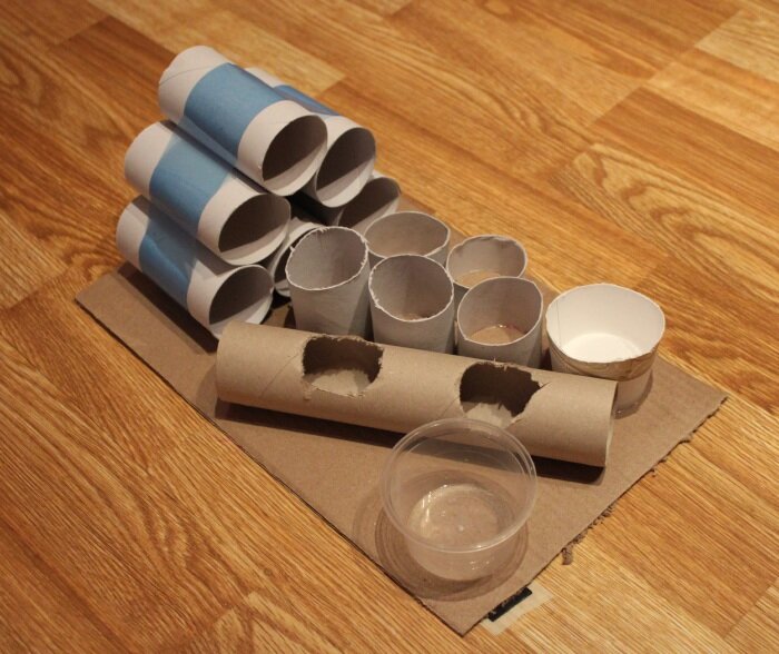 Приклейте рулоны от туалетной бумаги в разных положениях на плотный куск картона. Внутрь них положите мелочи, привлекающие внимание кота – например, крупные пуговицы, бусины. Кот будет пытаться достать их.