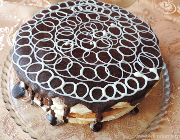 - Выливаем горячую глазурь на центр торта, даем самой растечься и ничем не помогаем. Как только глазурь затвердеет - торт можно подавать к столу. Я растопила грамм 20 белого шоколада и дополнительно украсила торт сверху.