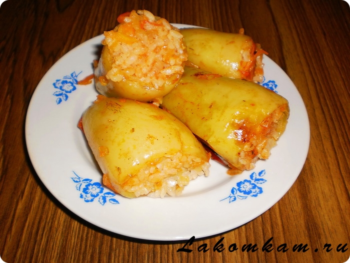Ингредиенты: болгарский перец — 5-6 штук; морковь — 1 штука; репчатый лук — 1 крупный; помидоры — 1-2 штуки; рисовая крупа — 100 грамм; соль и специи по вкусу; растительное масло — для жарки.